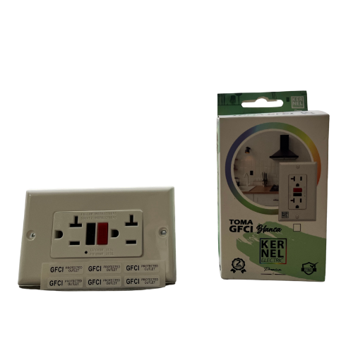 La toma GFCI (Ground Fault Circuit Interrupter) de Kernel brinda máxima protección contra descargas eléctricas por contacto indirecto, ideal para áreas con presencia de humedad como baños, cocinas, patios o exteriores. Su diseño en color blanco ofrece una apariencia moderna y discreta, perfecta para cualquier espacio residencial o comercial.